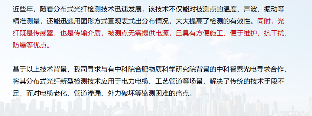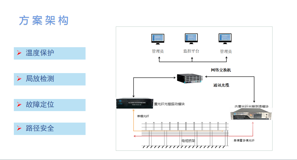 采用瑞利散射傳感器原理,監(jiān)測電力電纜安全距離范圍內(nèi)機械挖掘和人工挖掘,以及電纜橋架、電纜溝、電纜隧道垮塌等安全